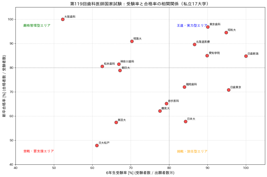 合格率は高いものの、受験率が低いエリアです。特に大阪歯科大学は、合格率100%を維持するために、受験者を5割台まで絞り込んでいます。「確実に合格できる精鋭」だけを卒業させることで、歯科医師としての質の高さは完璧に守られていますが、その高い壁を突破できなかった学生が、分母から大量に除外されている現実は見逃せません。