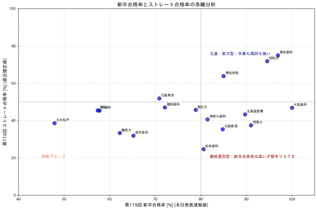 このグラフは、単なる「合格率」だけでは見えてこない、各大学の「教育スタンス(戦略)」を如実に物語っています。