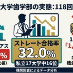 第118回歯科医師国家試験における岩手医科大学の新卒合格率は54.1%ですが、入学時を分母とした「ストレート合格率」は32.0%に留まります。入学者の約7割が、最短6年での歯科医師免許取得に苦戦しているという事実は、志望校選択において最も重視すべき指標です。