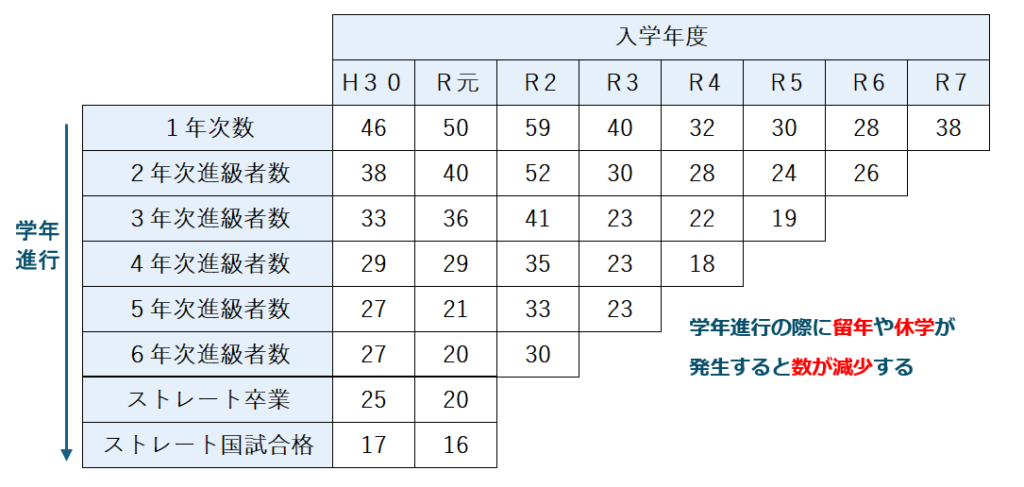 入学時46名に対し、6年次にストレートで進級したのは27名。さらに「ストレート卒業」は25名、最終的な「ストレート合格」は17名でした。ストレート合格率は37.0%です。6年次に到達した27名のうち、約37%にあたる10名が、卒業試験や国家試験という最後の一歩で立ち止まる結果となりました。