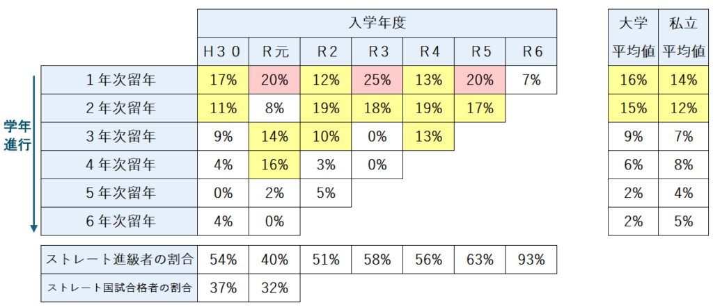 6年次における卒業留年率(約20〜27%)に加え、卒業後も国家試験で約46%の学生が足止めを食らうという「二重の壁」が確認されました。最終学年まで到達してもなお、最後まで気が抜けない過酷な状況が続いています。