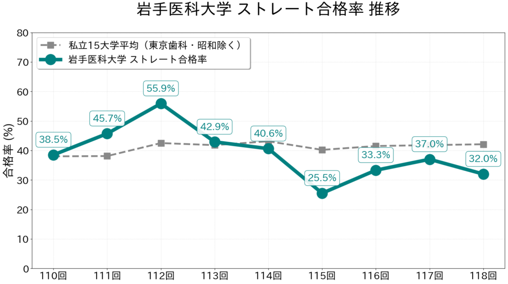 岩手医科大学の過去9年間(第110回〜第118回)のストレート合格率の推移と、私立大学内での順位を可視化しました。