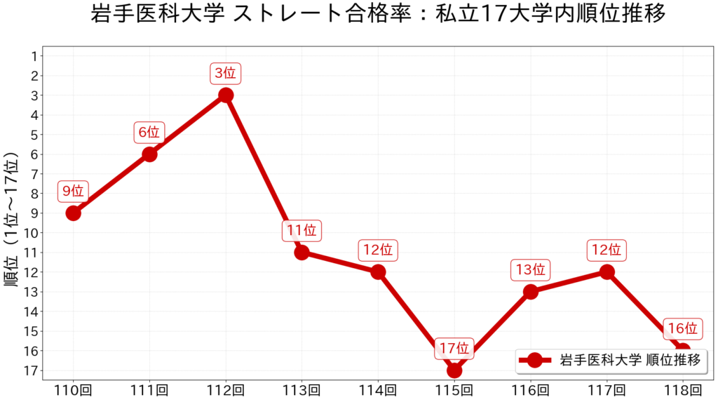 ストレート合格率は、その大学の教育力と進級の厳しさを相対的に評価する極めて重要な指標です。岩手医科大学の私立17大学内における順位は、過去9年間で激しく変動しています。