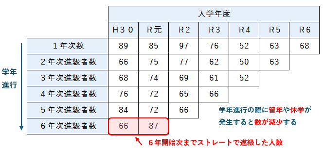 まずは松本歯科大学の各年度における入学者数と進級状況を確認していこう。
