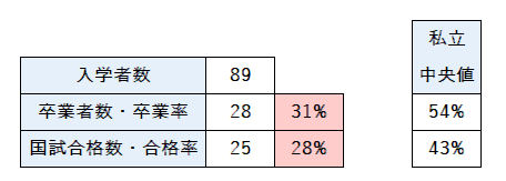 平成30年に松本歯科大学に入学した89人のうち、令和5年度に卒業できたのは28人(31%)、国家試験に合格したのは25人(28%)だった。どちらも私立大学の中央値より低い数字になっているよ。