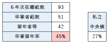 それを裏付けるように、標準修業年限での卒業率や国家試験合格率も、私立大学の中央値より低い数値となっていました。また、卒業留年率についても私立大学の中央値より高くなっています。