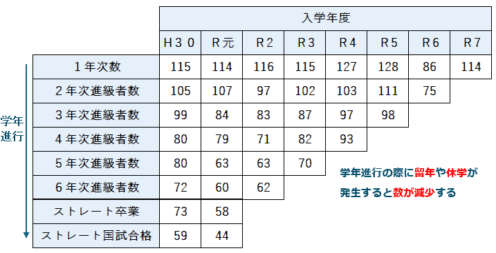 まず、入学した学生たちが歯科医師国家試験の合格まで、どのように推移しているのか。その「進級の階段」を可視化しました。学年進行の際に留年や休学が発生すると数が減少する仕組みです。この表において、最も注目すべきは「数字が減少するタイミング」です。