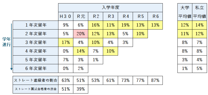 最終的に6年次に到達できたのは入学者114名中60名(52.6%)に過ぎず、入学者の約半数がストレートでは6年次にたどり着けていません。ストレート合格率は38.6%と、平成30年度入学者から12.7ポイントも急落しています。