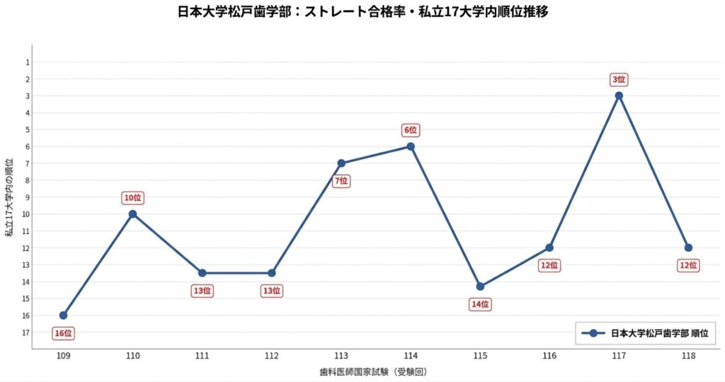 この順位推移は、日本大学松戸歯学部の「不安定さ」を端的に物語っています。