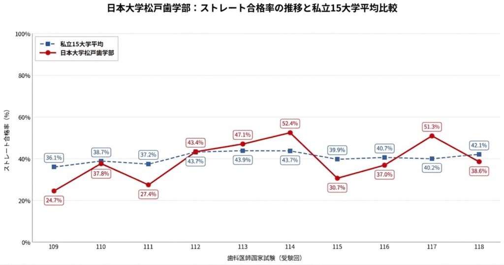 日本大学松戸歯学部の過去10年間(第109回〜第118回)におけるストレート合格率の推移は以下の通りです。当サイトの分析では、比較対象として「私立15大学平均」を用いています。これは、私立の中で突出した合格率を誇る東京歯科大学と昭和医科大学の2校を除いた平均値です。この2校は出口の成績が別格であり、平均に含めると他の大学の教育努力や実態が見えにくくなるため、あえて除外して分析を行っています。