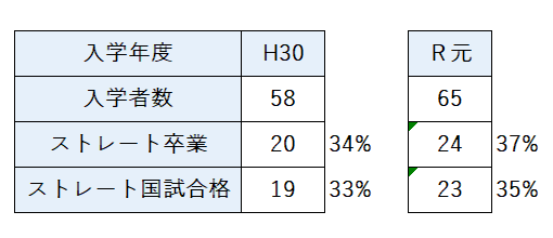 - 令和元年度に入学した65人のうち、留年せず修業年限内に卒業したのは24人(37%)。そのうち国家試験に合格したのは23人(35%)。