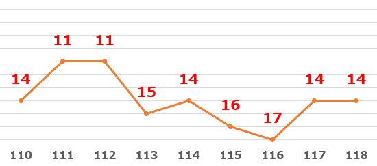 日本歯科大学新潟生命歯学部における、第110回歯科医師国家試験以降の私立17大学中におけるストレート合格率の順位推移をグラフで示しています。最高位は第111回・第112回の11位で、その後は第116回に17位となるなどやや低調でしたが、第117回・第118回はいずれも14位と、持ち直しの傾向が見られます。近年はやや厳しい状況が続くものの、令和3年度入学者はストレート進級率が高いため、第120回歯科医師国家試験では順位の上昇が期待されます。