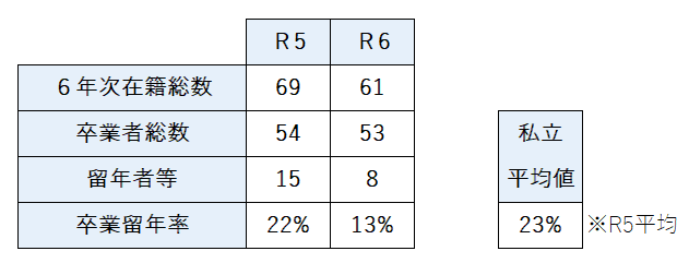 → 卒業留年率22% - 令和6年度:在籍6年生61人、卒業53人、留年者等8人