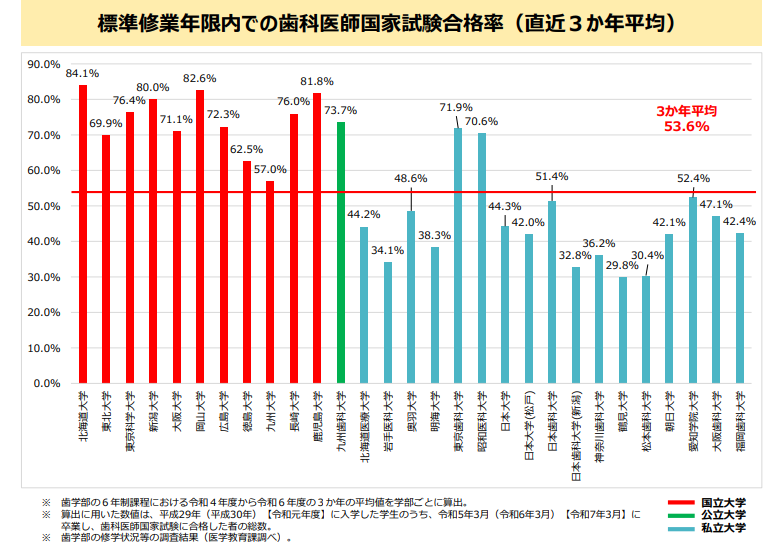 この資料によると、国公立大学を含む全国平均のストレート合格率は53.6%であり、歯学部でストレート進級・合格を達成することが容易ではないことが分かります。一般に、国公立大学と比べて相対的に学力分布が低めの学生が入学する傾向のある私立大学の歯学部では、ストレート合格率が3カ年平均で50%を超えるのは4校にとどまります。ストレート合格率の数値を見る際には、こうした全国的な基準も念頭に置いておきましょう。