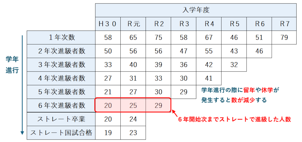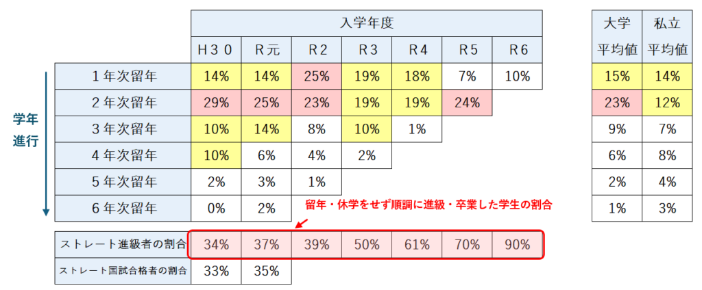 この表は、各年度の入学者数と進級者数に基づき、該当年度の入学者が学年の進行に伴ってどの程度の割合で留年したかを示しています。赤枠で囲った範囲では、令和7年5月時点で在籍している各入学年度の学生におけるストレート進級者の割合を示しています。