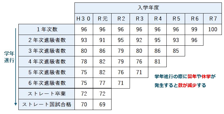 まず、入学した学生たちが歯科医師国家試験の合格まで、どのように推移しているのか。その「進級の階段」を可視化しました。この表において、最も注目すべきは「数字が減少するタイミング」です。