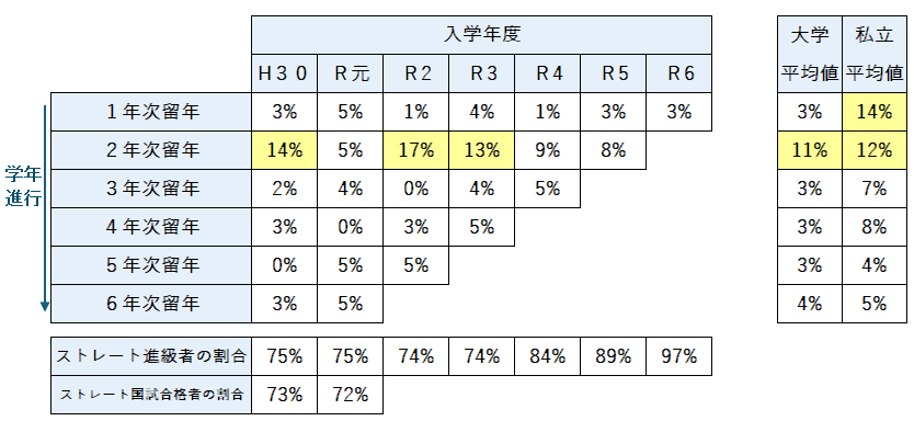 私は、入学者を分母とした「最低修業年限(6年)内での合格率」=ストレート合格率こそが、教育機関の質と誠実さを測る真実の指標であると考えています。