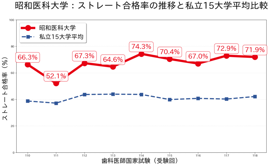 昭和医科大学の過去9年間(第110回〜第118回)におけるストレート合格率、および私立15大学平均との比較推移は以下の通りです。