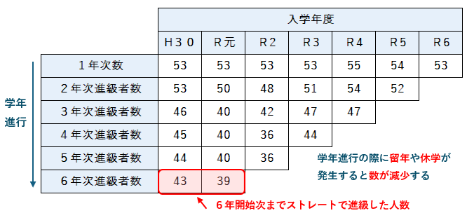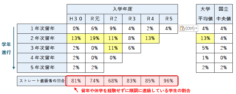 ストレートで進級している人の割合も高いけど、令和元年と令和2年入学者については、少しストレート進級者の割合が低い印象かな。