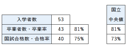 平成30年に東北大学へ入学した53人のうち、令和5年度に卒業できたのは43人(81%)、国家試験に合格したのは40人(75%)だった。どちらも国公立大学の中央値とほぼ同等の数値だよ。