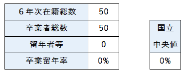 修業年限内の国家試験合格率も、国立大学の中央値よりやや高い水準です。また、平成30年度入学者の6年次の卒業留年率は0%となっており、6年次のカリキュラムで苦戦する学生はほとんどいないようです。