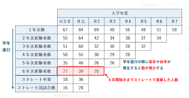 - 令和2年度(69名入学): 2年次進級者は42名でしたが、6年次進級時点では20名まで絞り込まれています(ストレート進級率 29.0%)。1年次から6年次にかけて、ストレート進級者が大きく絞り込まれている状況です。