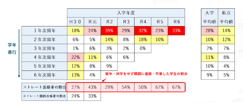 - 令和6年度(51名入学): この年度は2年次への進級者が34名となりました。1年次の留年率が33%と高水準にあるため、初動の学習習慣が鍵となっています。