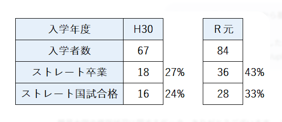 - 令和元年度(84名入学): 6年次までストレートで到達したのは39名です。平成30年度と比較すると、合格者数は28名(合格率33.3%)まで上昇しており、改善の兆しが見て取れます。