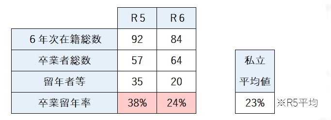 - 卒業留年率の減少: 令和5年度は38%台と非常に高かった卒業留年率が、直近の令和6年度では24%まで低下しました。全国平均(23%)と同水準まで改善しています。