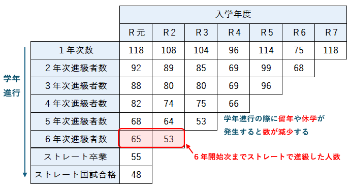 • 令和2年度(108名入学): 6年次までストレートで到達したのは53名です。令和元年度と比較すると、6年次到達時点での人数がさらに絞り込まれている傾向が見て取れます。