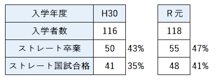 • 令和元年度(118名入学): 2年次への進級時に26名が減少(進級率78.0%)し、最終的にストレートで卒業したのは55名、国家試験に現役合格したのは48名でした。入学時の人数から換算すると、**ストレート国試合格率は40.7%**となります。