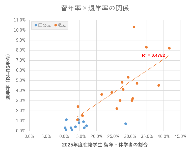 横軸は2025年度の留年学生の割合、縦軸は過去3か年の退学率の平均値です。