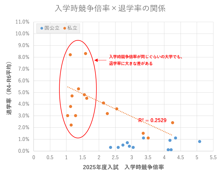 私立大学のデータでは、決定係数R²=0.2529となり、留年率ほど強い相関ではありませんが、入学時競争倍率が低いほど退学率が高くなる傾向が見られます。