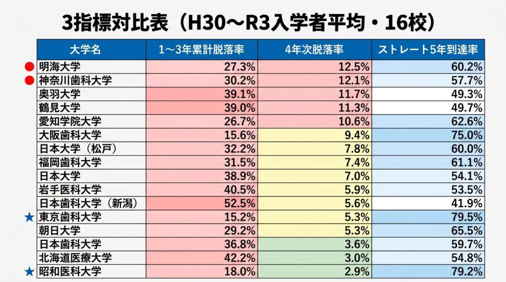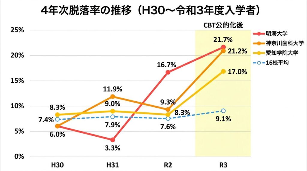 私立歯学部16大学のストレート5年到達率は、平均で約60%、ワースト校では34%にまで落ち込みます。CBT公的化(令和6年4月)後の最初の入学年度(令和3年度)では、明海・神奈川・愛知学院の4年次脱落率が+8〜12pt動きました(ただし1年度分のみのデータで「兆候」段階です)。