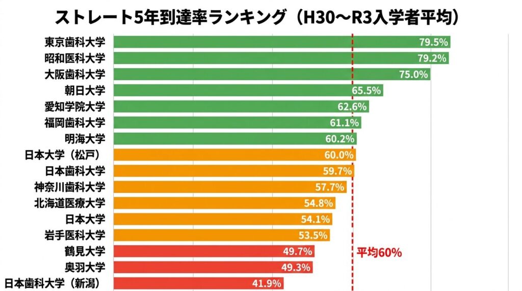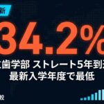 令和3年度入学者では明海大学が34.2%まで低下し、私立16校で最低となりました。神奈川歯科大学 51.0%、奥羽大学 40.5%もワースト圏に入っています。100人入学して34人しかストレート到達できない大学があるという事実は、受験校選びの段階で押さえておきたいポイントです。