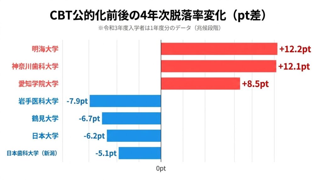 4年次は歯学部生にとって大きな関門です。歯学共用試験(CBTとOSCE)が令和6年4月に公的試験化され、合格しなければ5年次の臨床実習に進めない制度が全国統一基準で運用されはじめました。公的化後の最初の入学年度(令和3年度入学者)では、明海大学・神奈川歯科大学・愛知学院大学の4年次脱落率が前年度までの平均比で+8〜12pt動いています(ただし1年度分のみのデータのため「兆候」段階です)。