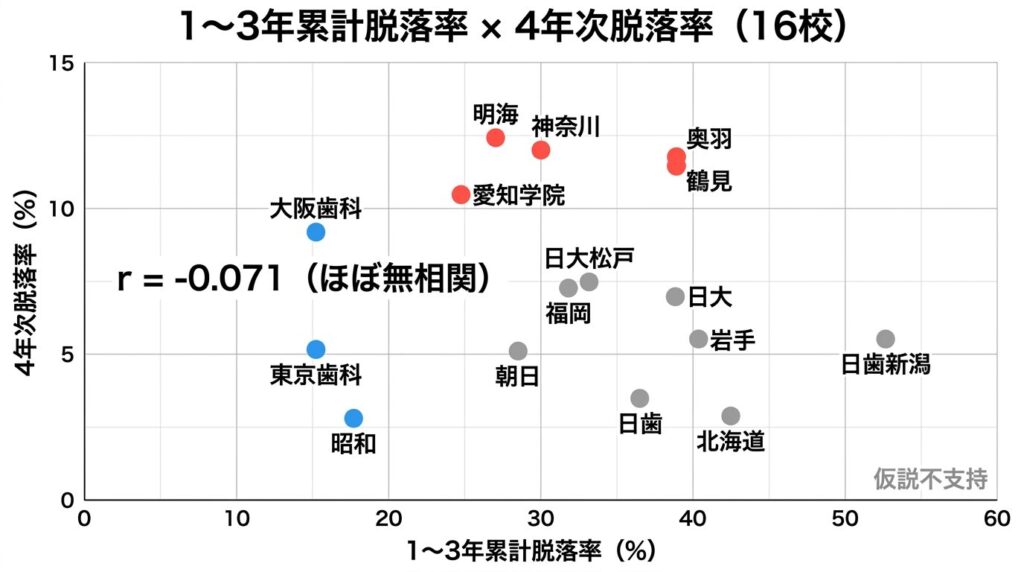 1〜3年次累計脱落率と4年次脱落率の相関係数はr = -0.071(16校)。統計的にはほぼ無相関で、トレードオフ仮説は全体傾向としては不支持です。