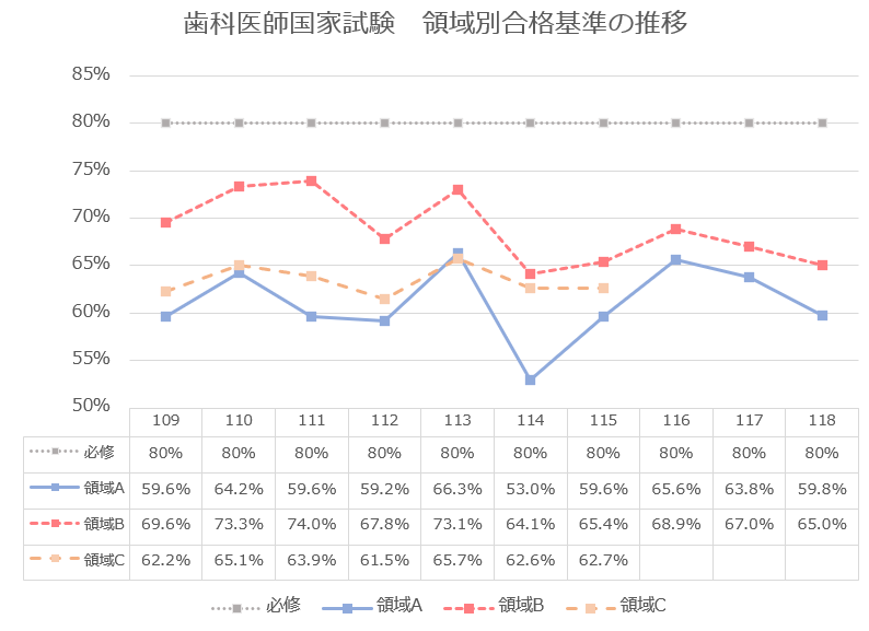 歯科医師国家試験の過去10年間における合格基準の推移を、以下のグラフに示します。第116回以降は3つの領域(必修・領域A・領域B)で合否判定が行われるため、領域Bと領域Cが統合されたことに伴い、グラフには領域Cを表示していません。