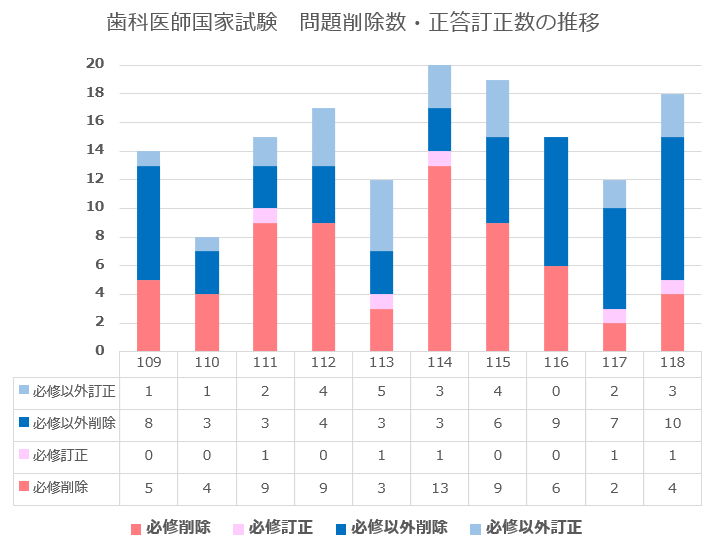 特に必修問題は、合格基準が80%以上という絶対基準のため、難易度が過度に高かった年には、上記①のパターンで問題の削除や正答訂正などの措置により調整していると見受けられます。なかでも第114回は対応が最多で、必修80問のうち削除13問・正答訂正1問の計14問、すなわち17.5%が削除等の取り扱いとなりました。第109回から第118回の歯科医師国家試験において、問題の削除や正答訂正などの措置をされた問題数の推移は下記図のとおりです。