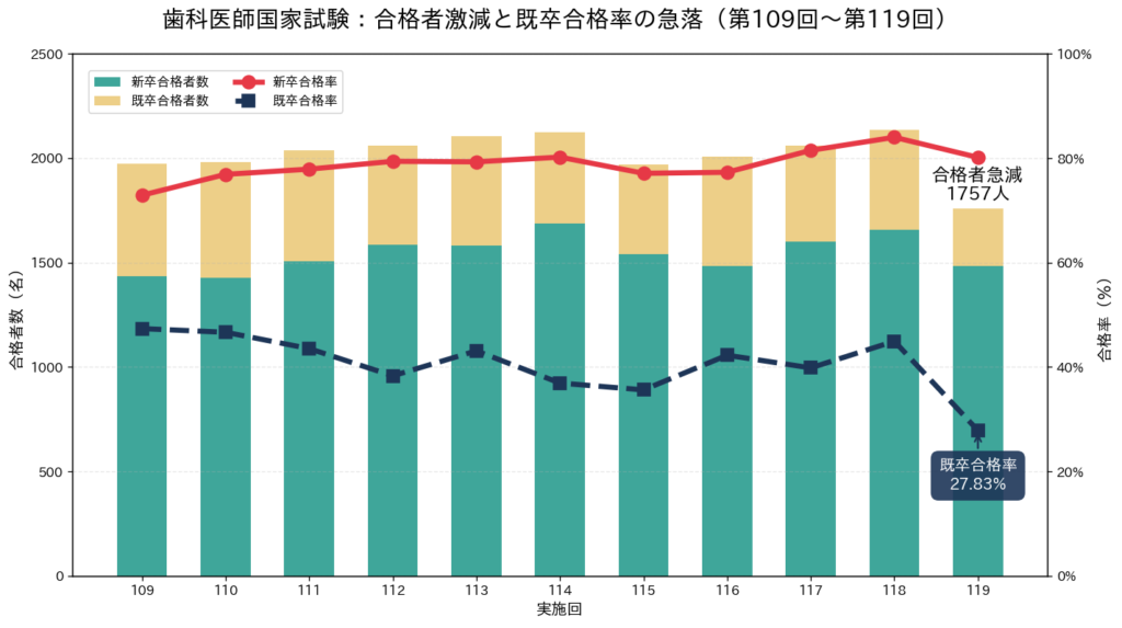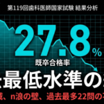 3月16日に発表された第119回歯科医師国家試験の結果は、受験者や関係者に大きな衝撃を与えました。一言で表すならば、「新卒者の合格率は保たれたが、既卒者の合格率が急減した試験」です。