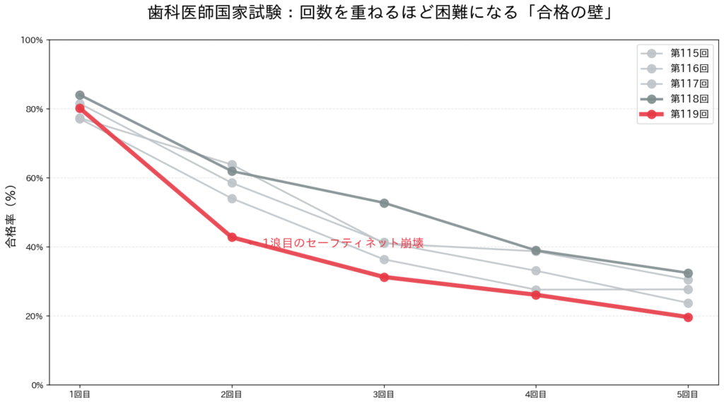 第119回のデータが突きつけたのは、歯科医師免許取得において「新卒での合格を逃すと、その後の合格難易度が飛躍的に上がる」という厳しい現実です。