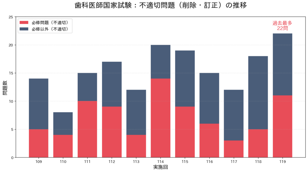第119回歯科医師国家試験において、「採点除外(削除)および正答訂正」が合計22問という、過去11年間で最多の不適切問題を記録しました。