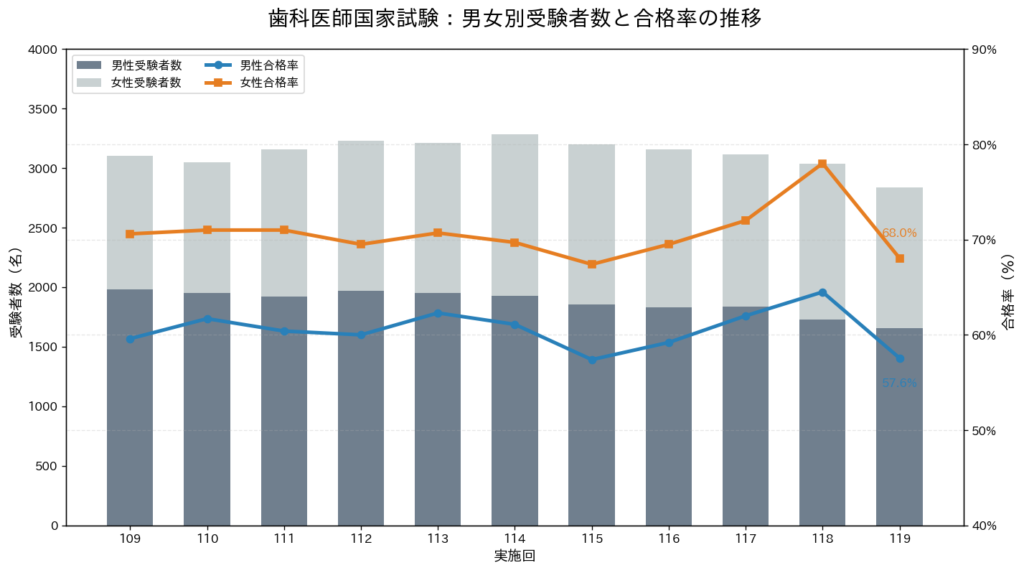 歯科医師国家試験のデータを性別という切り口で観察すると、毎年のように繰り返される非常に顕著な傾向が見て取れます。今回の第119回試験においても、その傾向は例外ではありませんでした。